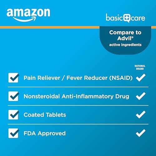 STRONG RELIEF: Amazon Basic Care Ibuprofen Tablets 200 mg are strong on tough pain to help you get the relief you need to keep going; no prescription needed for this pain reliever and fever reducerEFFECTIVE: When pain tries to take over, turn to the proven pain relief of coated Amazon Basic Care Ibuprofen Tablets 200 mg; use for adults and children 12 years and over