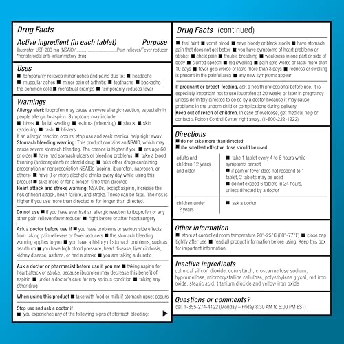 ACTIVE INGREDIENT: This product contains ibuprofen 200 mg, a pain reliever and fever reducer (NSAID); compare to the active ingredient in Advil Ibuprofen TabletsPAIN RELIEVER AND FEVER REDUCER: Proven pain relief without a prescription for tough pain such as muscular aches, minor arthritis pain, toothache, backache, menstrual cramps or minor aches and pains from the common cold; also temporarily reduces fever