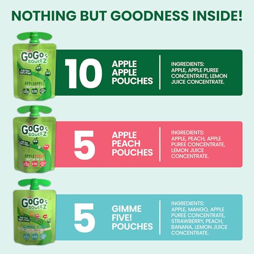 Stock your pantry or fridge with this pack of 20, 3.2 ounce kid-approved snack pouches (3 flavors to choose from); GoGo squeeZ Fruit on the Go squeeze pouches are kitchen pantry safe (no refrigeration required)