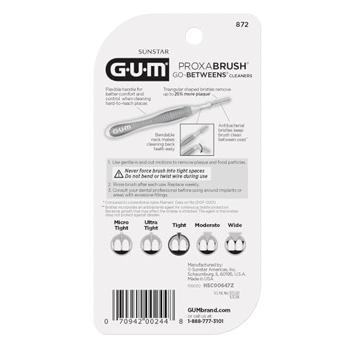 Go beyond brushing with GUM Proxabrush Go-Betweens. Between-teeth cleaning is essential for removing plaque from hard-to-reach areas that are missed by brushing alone….But tight teeth, difficulty gripping floss, and a simple lack of time prevent many of us from flossing as often as we should. Proxabrush Go-Betweens Interdental Cleaners are clinically designed by dental professionals to offer a quick, easy, and effective alternative to flossing. Our Tight reusable floss brushes are specifically made to remove plaque and food particles from tighter interdental spaces, the perfect braces cleaner. Each floss brush features coated bristles and a breathable travel cap that allows for up to ten days of use. With GUM Proxabrush Go-Betweens, cleaning the hard-to-reach areas in your mouth has never been easier. A non-slip rubber handle and bendable neck make it easy to maneuver to the back of the mouth while nylon coated wire cleans around braces, bridges, implants, and other dental devices without the risk of scratching or galvanic shock. Features : ● Designed for tight interdental spaces ● Triangular bristles for 25% more effective plaque removal* ● Nylon coated wire is a perfect braces brush for cleaning. ● Coated bristles and a breathable travel cap allow 10 days of use ● Non-slip rubber handle for easy grip ● Bendable neck for further reach Our dental brushes make it easy to carry a confident smile with you wherever you go. Different from flosser picks, each interdental brush features a compact, portable size that fits easily into purses, pockets, and travel kits for healthier gums, cleaner teeth, and fresher breath anytime, anywhere. *vs DOF-0001