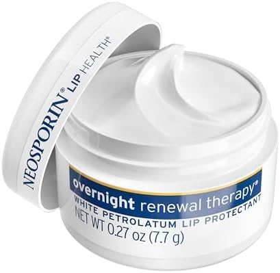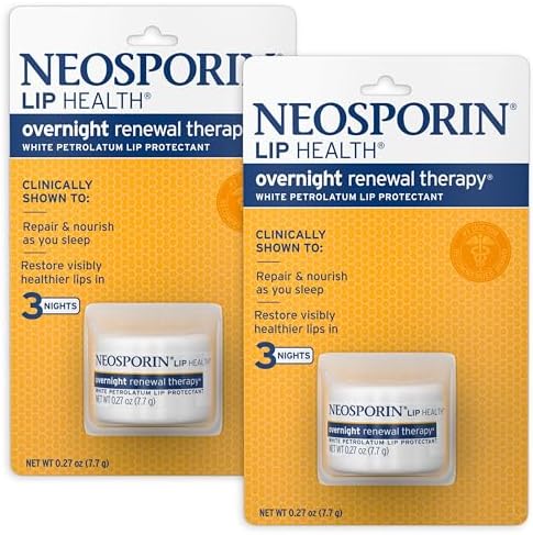 Twin pack containing two 0.27-ounce tubs of Neosporin Lip Health Overnight Renewal Therapy Lip Protectant with white petrolatum to help hydrate and nourish your lips, the most fragile skin on your body