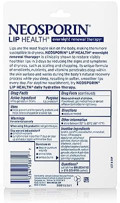 Hydrate lips and improve healthy lip tone with Neosporin Lip Health Overnight Renewal Therapy Lip Protectant for dry, chapped lips. The lip moisturizer is clinically shown to restore visibly healthier lips in three nights by reducing signs of dryness, such as scaling and chapping. Lips are the most fragile skin on the body, which can make them more susceptible to dryness. Containing a unique combination of antioxidants and essential lipids, this lip protectant penetrates deep within the skin surface and works during the body’s natural recovery process while you sleep. The unique formula of this lip moisturizer contains vitamins, emollients and peptides to repair, nourish and smooth your lips while you sleep. Apply night lip treatment as needed.