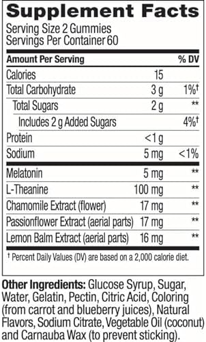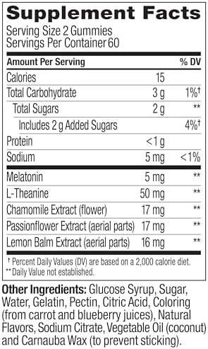 OLLY Extra Strength Sleep gummies for adults deliver a delightful blend of active ingredients that work together to promote restful sleep so you wake up feeling refreshed. These 5mg Melatonin gummies, with L-Theanine to work with your body to help you fall asleep and stay asleep.* Includes traditional Botanical Extracts like Chamomile and Lemon Balm. Deliciously flavored with Blackberry and a hint of mint with other natural flavors, these Sleep gummy supplements help you drift off.* They’re delightfully tasty, scientifically formulated and gluten-free. *These statements have not been evaluated by the Food and Drug Administration. This product is not intended to diagnose, treat, cure or prevent any disease. For occasional sleeplessness. CAUTION: Melatonin may cause drowsiness or sleepiness; do not take while driving, operating machinery, or engaging in any activity that requires alertness. This product is not intended to treat insomnia or other sleep disorders.
