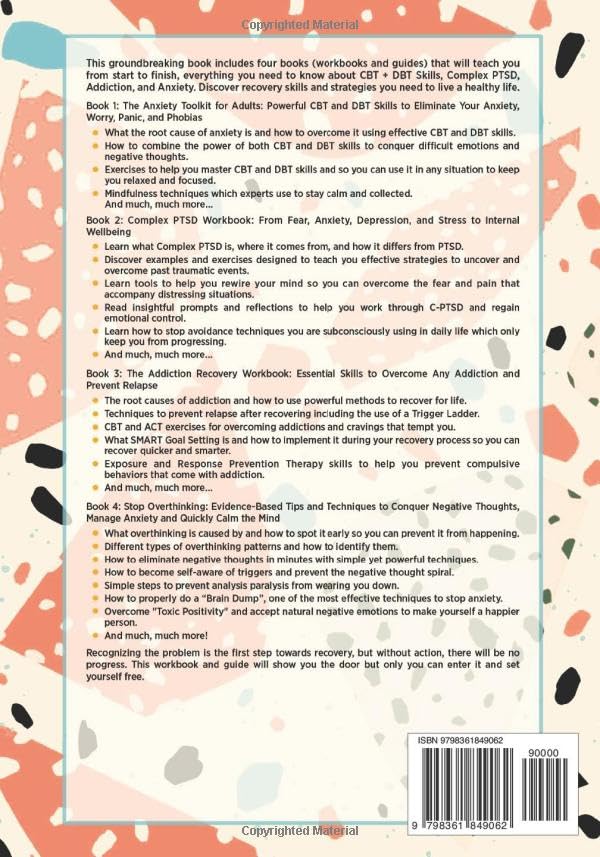 This groundbreaking book includes four books (workbooks, guides and video course) that will teach you from start to finish, everything you need to know about CBT + DBT Skills, Complex PTSD, Addiction, and Anxiety. Discover recovery skills and strategies you need to live a healthy life.*Bonus* Online Course: The Ultimate Guide to CBT